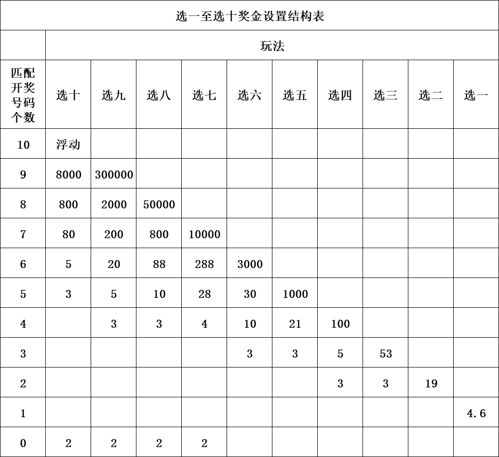 第二十条 “选十”玩法中,当期“选十中十”奖等的奖金总额为“选十”玩法销售额计提的当期奖金减去“选十”玩法当期实际中出的固定奖奖金总额后,与“选十”玩法奖池资金之和,单注奖金按注均分,并以元为单位取整计算,单注奖金最高封顶500万元。
